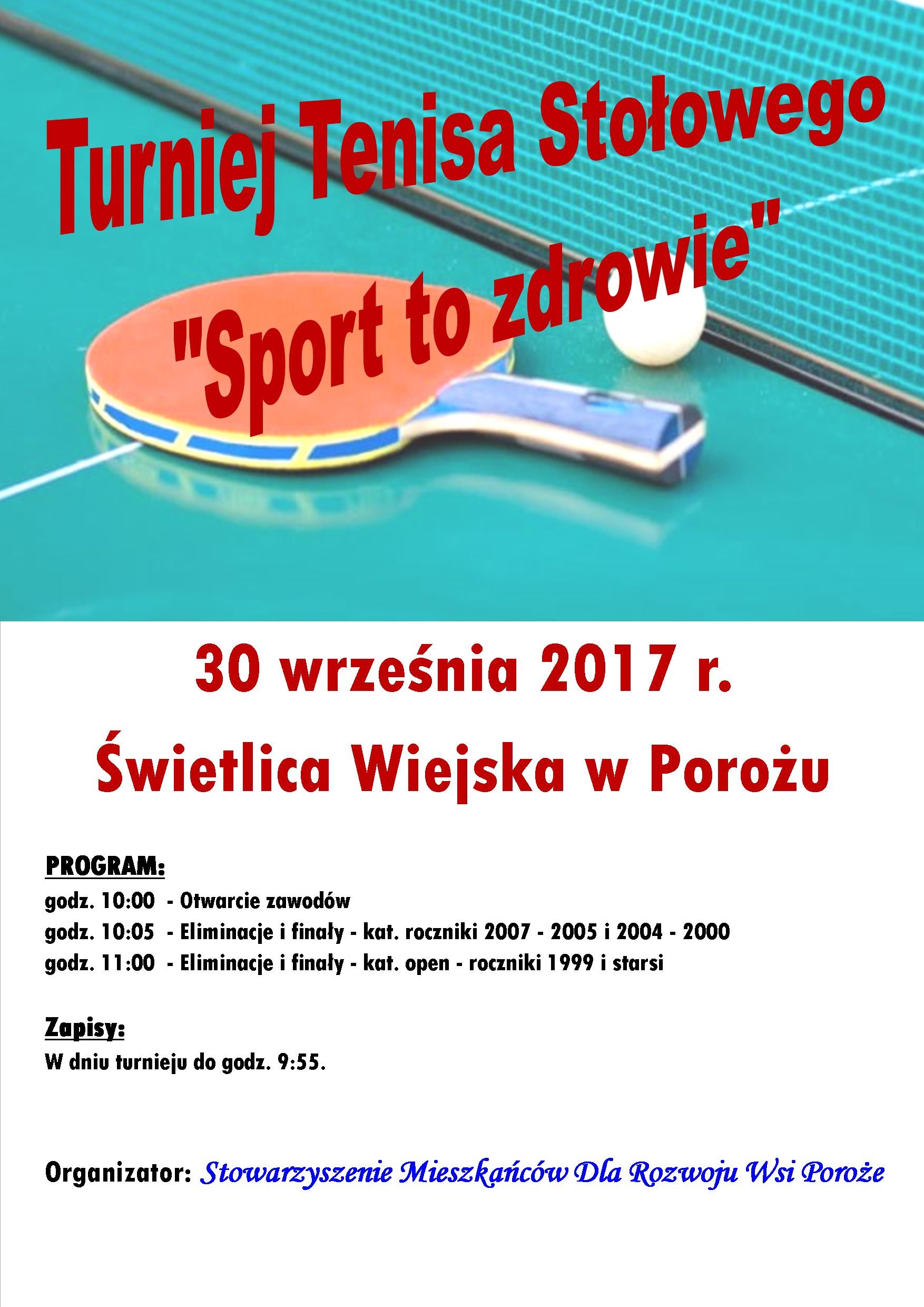 Stowarzyszenia Mieszkańców Dla Rozwoju Wsi Poroże zaprasza mieszkańców gminy Malanów do udziału w Turnieju Tenisa Stołowego „Sport to zdrowie”, organizowanego w dniu 30.09.2017 r. w Świetlicy Wiejskiej w Porożu. Początek zawodów od godz. 10:00. Zapisy w dniu zawodów do godz. 9:55. Szczegółowe informacje w załączonym regulaminie. „Projekt współfinansowany przez Gminę Malanów w ramach współpracy z organizacjami pozarządowymi.”